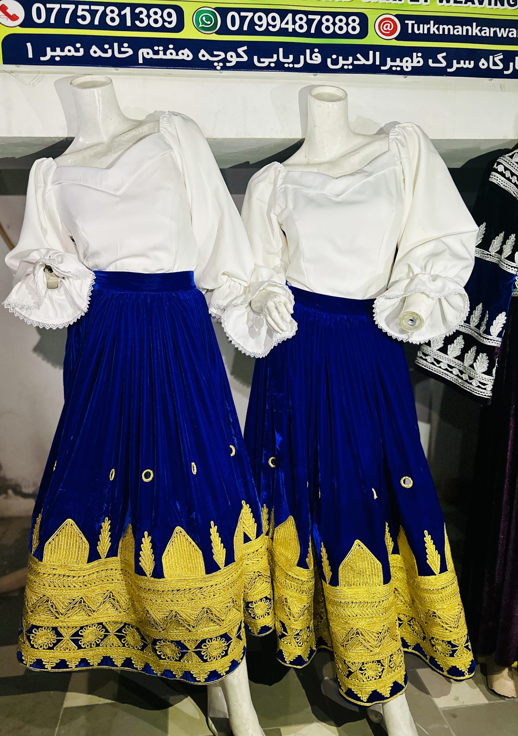 This traditional dress includes a velvet skirt with intricate cherma dozi embroidery and a blouse sewn from high-quality fabric, carefully crafted by our skilled and talented women artisans.