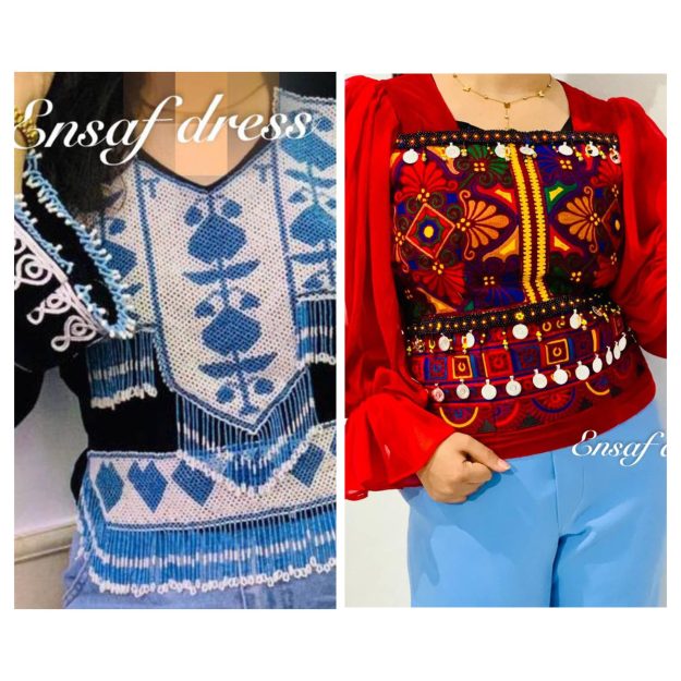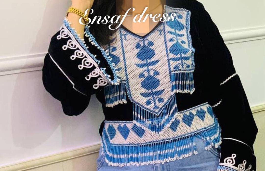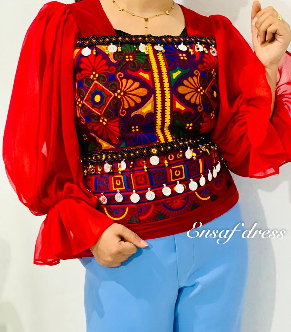 These elegant traditional Afghan tops are crafted from soft silk velvet fabric. The red top is designed with flowing chiffon sleeves and colorful embroidered patterns adorned with small coins, giving it a lively and festive look. The black top features intricate white and blue embroidery with a detailed beaded neckline, adding a touch of sophistication and tradition. Â