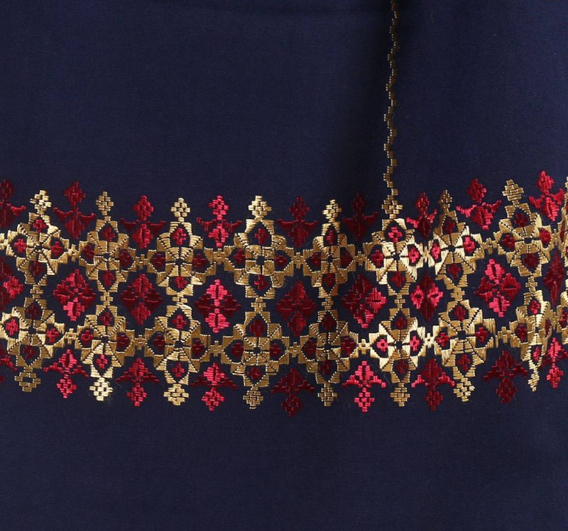 Features: Comfortable, Soft hand,Absorbent, Good color retention, Machine-washable, dry-cleanableMaterial. Fabric: Cotton Fabric Design: Goldozi/Khamak (Bamyani Embroidery) Navy blue in color Size: 225 cm x 150 cm