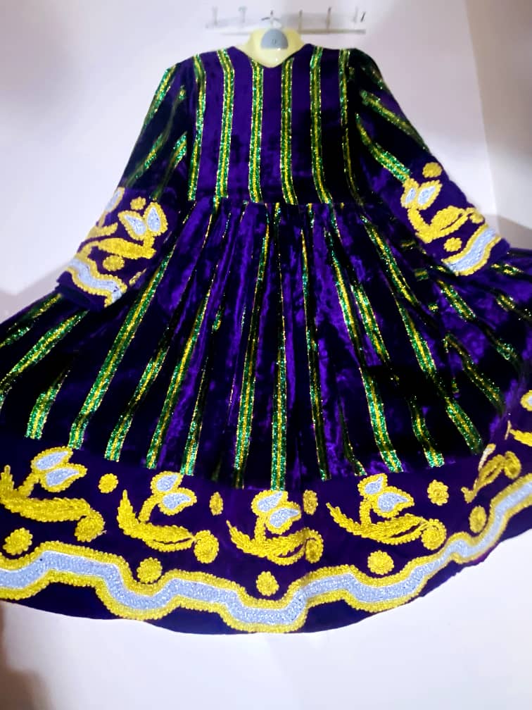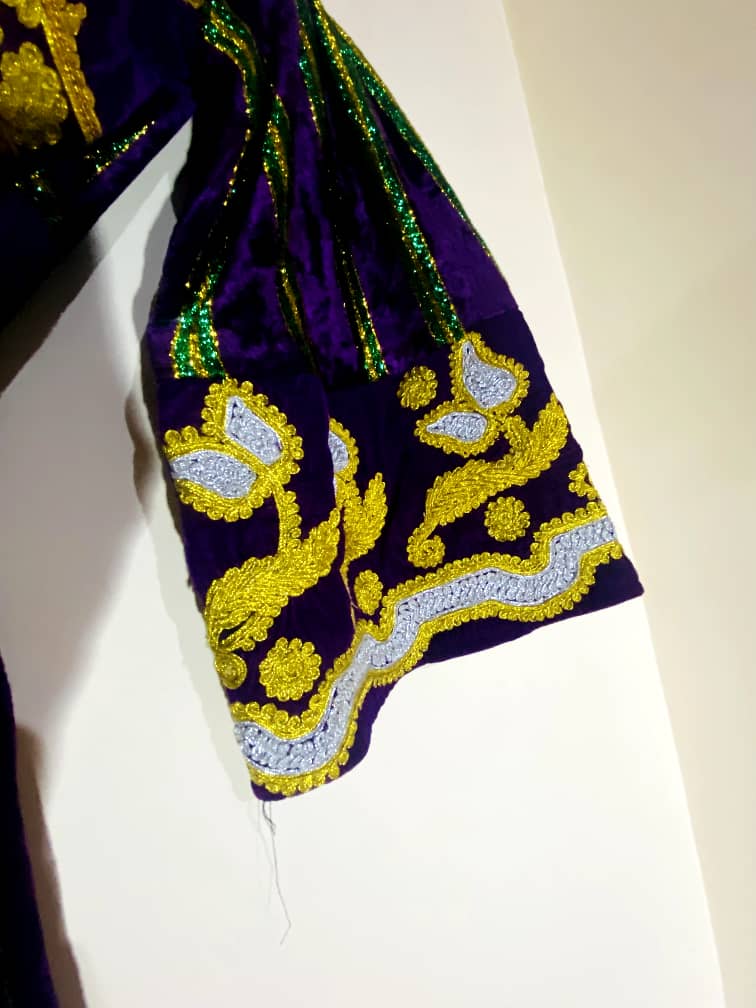 Traditional Afghan Embroidered Velvet Dress – Purple and Gold Handmade Design