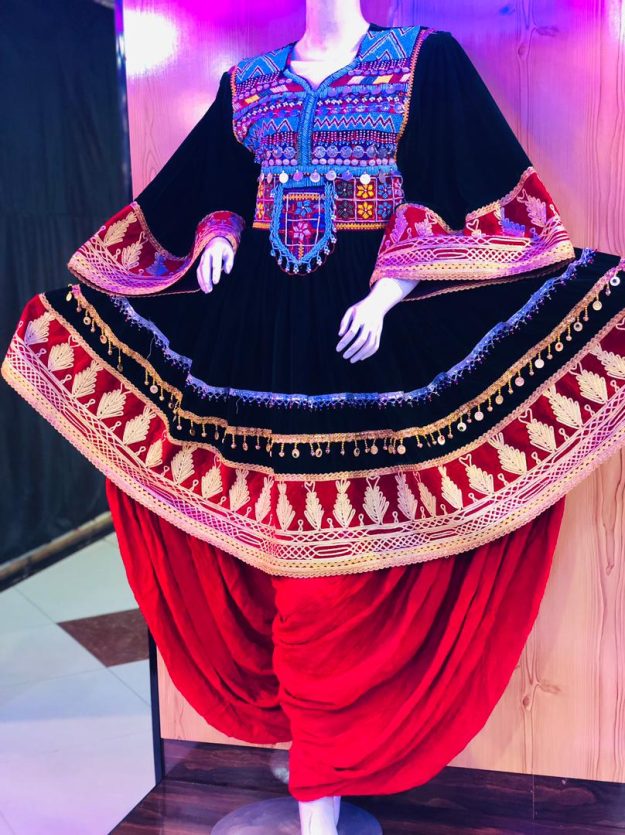This stunning traditional Afghan dress is a true reflection of cultural heritage and fine craftsmanship. The bodice is beautifully decorated with handmade leather embroidery, traditional coins, and colorful patterns that add elegance and charm.